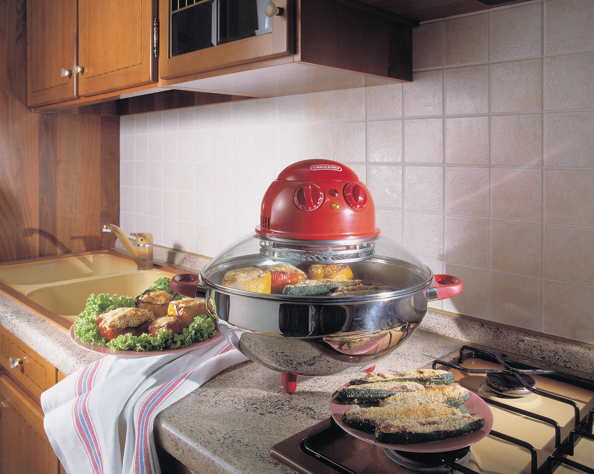 E’ un vero e proprio forno “ad aria calda”, caratterizzato da limitato ingombro, praticità d’impiego e pulizia, comodità di trasporto ed ubicazione. In casa, in tenda, in camper ed ovunque c’è una “presa”. Funziona a corrente normale, senza eccessi di consumo. Grazie alla trasparenza del coperchio è possibile controllare “in diretta” il processo di cottura dei cibi.; senza ricorrere ad aperture e quindi dispersione di calore ed energia. La griglia alta è consigliabile per cuocere ai ferri, tostare, friggere piccoli pesci, preparare pizze, dorare. Mentre la griglia bassa è preferibile per arrostire, preparare torte, scongelare e cuocere grandi porzioni. Si possono usare contemporaneamente le due griglie senza che si mischino i sapori.