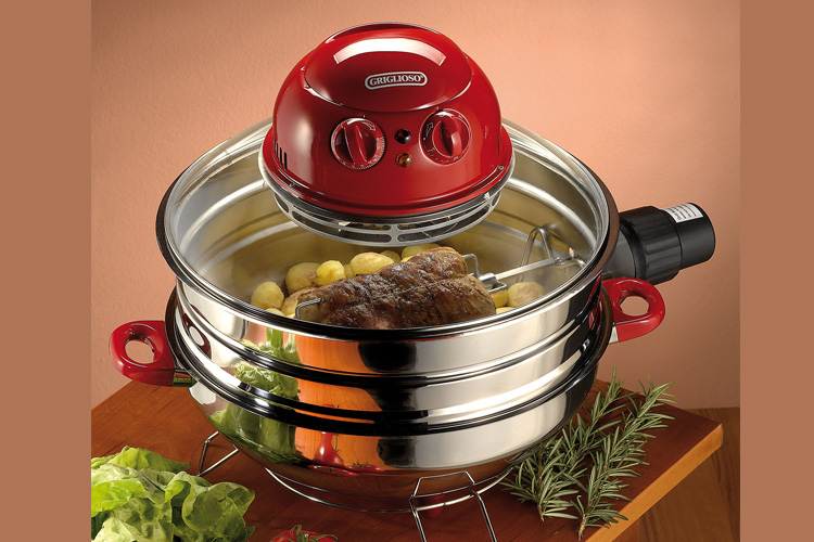 Con il Girarrosto potrai perfezionare la cottura delle carni allo spiedo, solitamente pollo o galletto, ma anche quaglie, arrosti di maiale, di coniglio, di agnello, ecc. E’ composto da un anello estensore da applicare al tuo Griglioso, un supporto da appoggiare sul fondo della pentola, uno spiedo per infilare la carne, 2 forchette per bloccarla e un dispositivo meccanico che gira continuamente. La perfetta simbiosi del sistema di cottura del tuo Griglioso in abbinamento al girarrosto soddisferà il tuo palato da Chef.